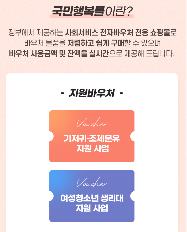 국민행복카드를 발급받은 분들이 지원받은 바우처 포인트를 사용하여 기저귀, 조제분유, 생리대 등 필수 물품을 쉽고 저렴하게 구매할 수 있도록 만들어진 플랫폼입니다.