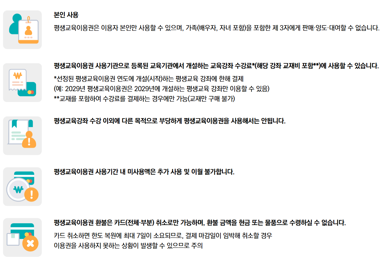 - 사용 범위: 강좌 수강료뿐만 아니라 해당 강좌에 필요한 교재비도 함께 결제 가능합니다.